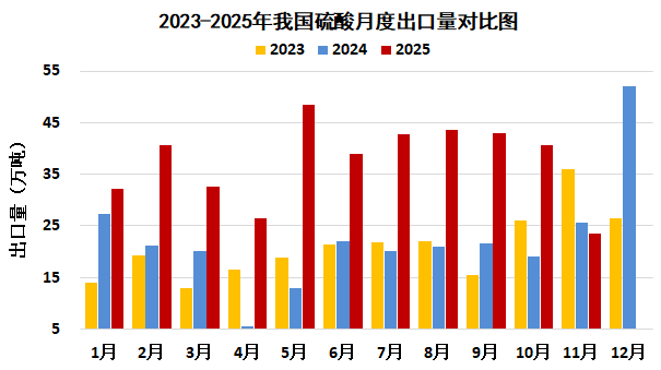 据中国海关统计,2025年1-11月我国出口硫酸412.4万吨,较去年同期增加196.1万吨,增幅90.7%;平均出口价格61.7美元/吨,较去年同期上涨31.1美元/吨,涨幅101.9%。