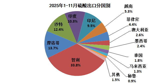 2025年1-11月,我国硫酸出口前三名国家为智利(139.3万吨)、摩洛哥(56.4万吨)、沙特(51.2万吨),向这三个国家出口硫酸量总出口量的59.9%;按省份(企业注册地)统计,出口前三名的省份为广西(134.9万吨)、江苏(110.7万吨)、安徽(89.7万吨)。