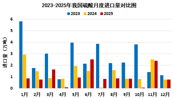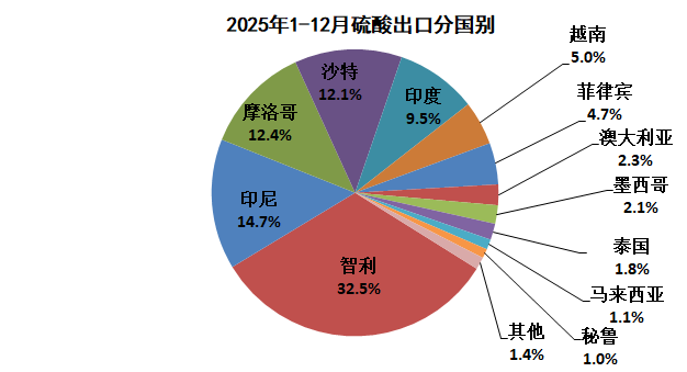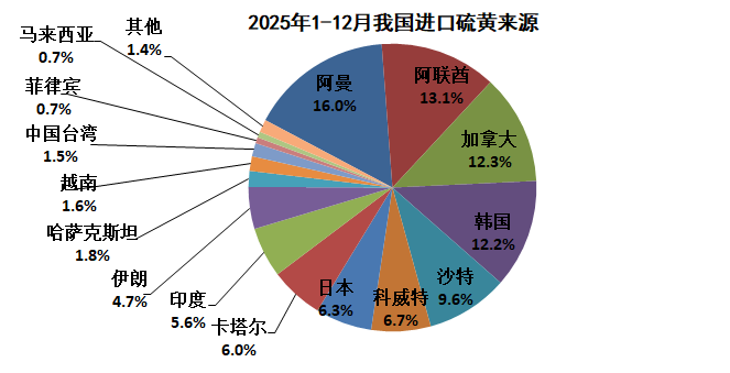 2025年1-12月,主要是从韩国(11.7万吨)、中国台湾(0.9万吨)进口硫酸。