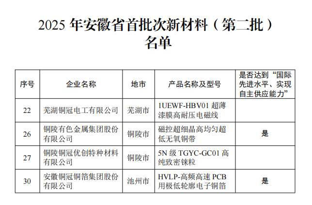 日前,安徽省工业和信息化厅公布了2025年安徽省首批次新材料(第二批)名单。铜陵有色集团下辖的4个子公司——铜陵有色金属集团股份有限公司产品“磁控超细晶高均匀超低无氧铜带”、铜陵铜冠优创特种材料有限公司产品“5NTGYC-GC01高纯致密铢粒”、安徽铜冠铜箔集团股份有限公司产品“HVLP-高频高速 PCB用极低轮廓电子铜箔”、芜湖铜冠电工有限公司产品“1UEWF-HBVO1超薄漆膜高耐压电磁线”成功入选。