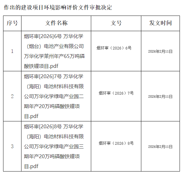 近日,烟台市人民政府发布了《【万华化学(烟台)电池产业有限公司万华化学莱州年产65万吨磷酸铁锂项目】等环境影响评价文件审批决定》。
