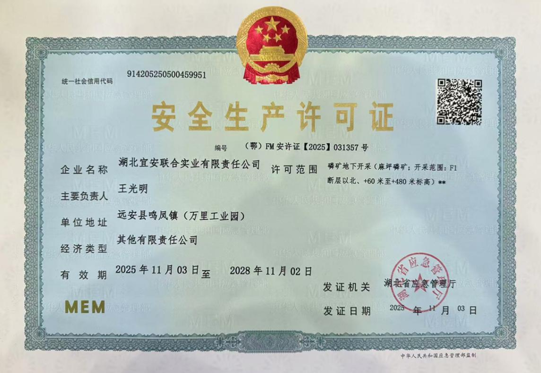 11月3日,湖北宜安联合实业有限责任公司(简称湖北宜安)所属麻坪磷矿成功取得湖北省应急管理厅颁发的安全生产许可证,标志着该矿全面建成并正式投产。作为资源禀赋优异的矿山,麻坪磷矿在四年多的建设过程中克服诸多挑战,展现出卓越的创新特色与管理水平。这一里程碑不仅是湖北宜安在矿山建设与管理方面取得的重大阶段性成果,也将为公司与地方带来新的经济与社会效益增长点,成就值得庆贺。