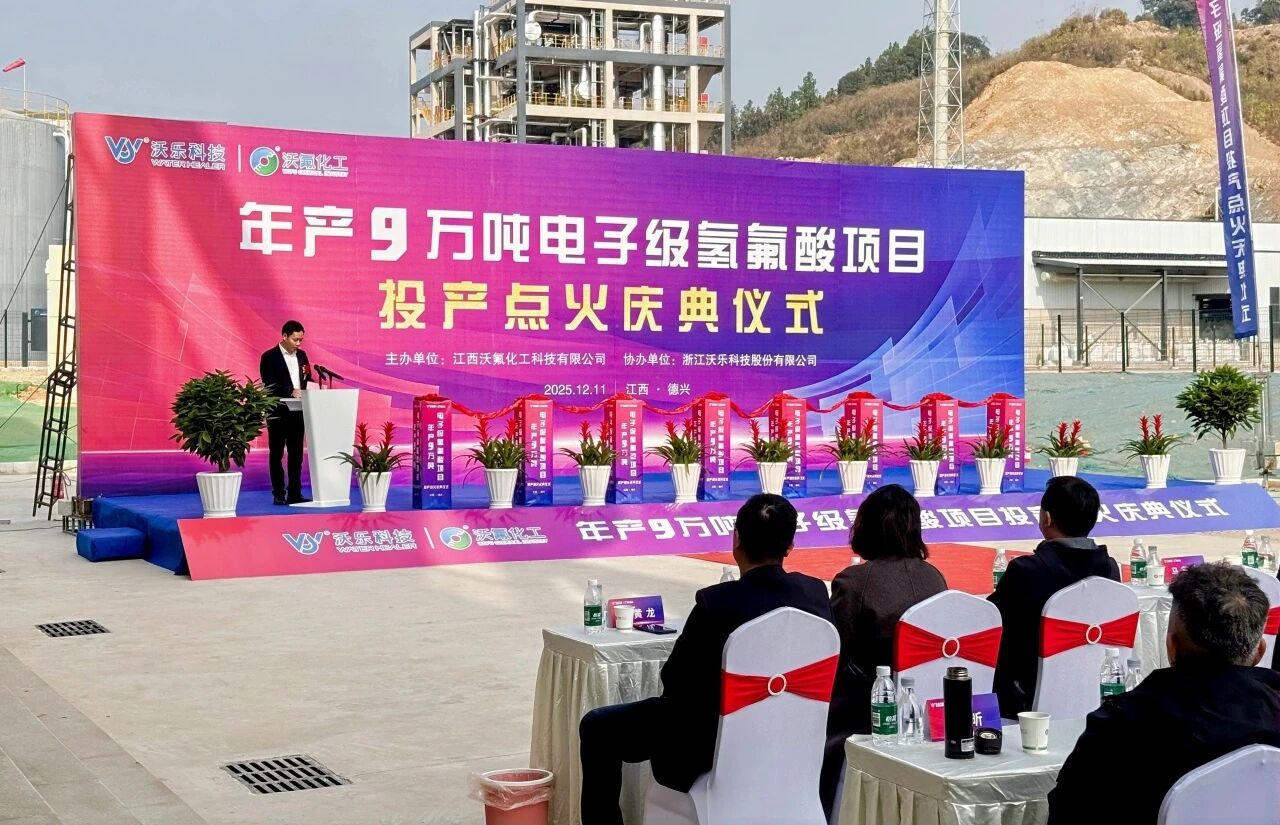 12月11日,沃乐科技全资子公司江西沃氟化工科技有限公司的年产9万吨电子级氢氟酸项目投产点火仪式在各界期待中隆重举行。