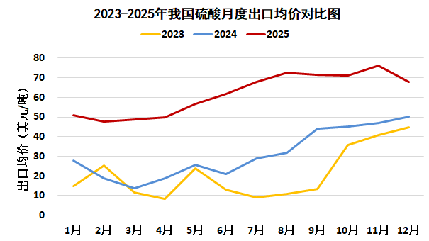 据中国海关统计,2025年1-12月我国出口硫酸464.9万吨,较去年同期增加196.7万吨,增幅73.3%;平均出口价格62.4美元/吨,较去年同期上涨28.2美元/吨,涨幅82.5%。