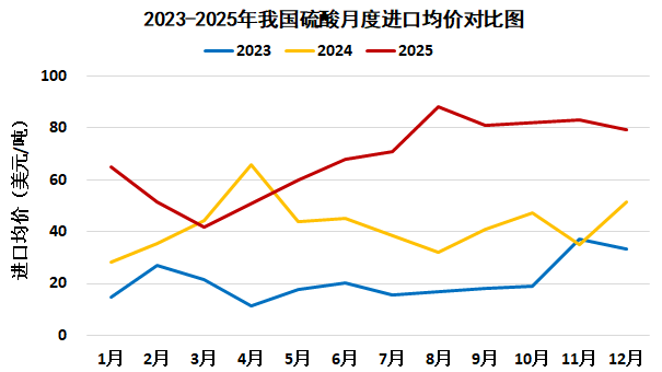 据中国海关统计,2025年1-12月我国进口硫酸12.6万吨,较去年同期减少3.6万吨,降幅22.1%。剔除高价酸后,平均进口价格70.2美元/吨,较去年同期增长30.0美元/吨,涨幅74.4%。