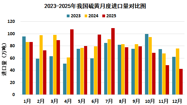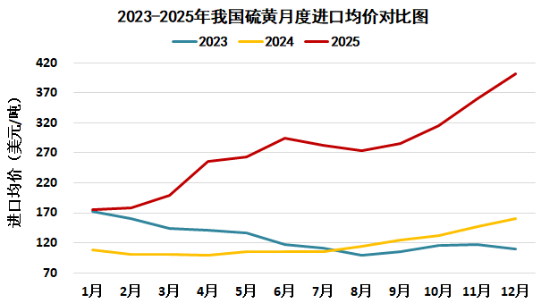 据中国海关统计,2025年1-11月中国进口硫黄960.8万吨,较去年同期减少34.4万吨,降幅3.5%;平均进口价格265.3美元/吨,较去年同期上涨149.1美元/吨,涨幅128.2%。