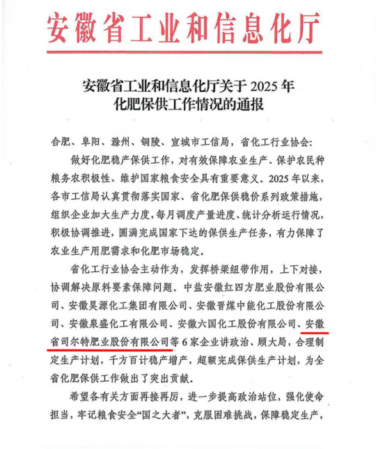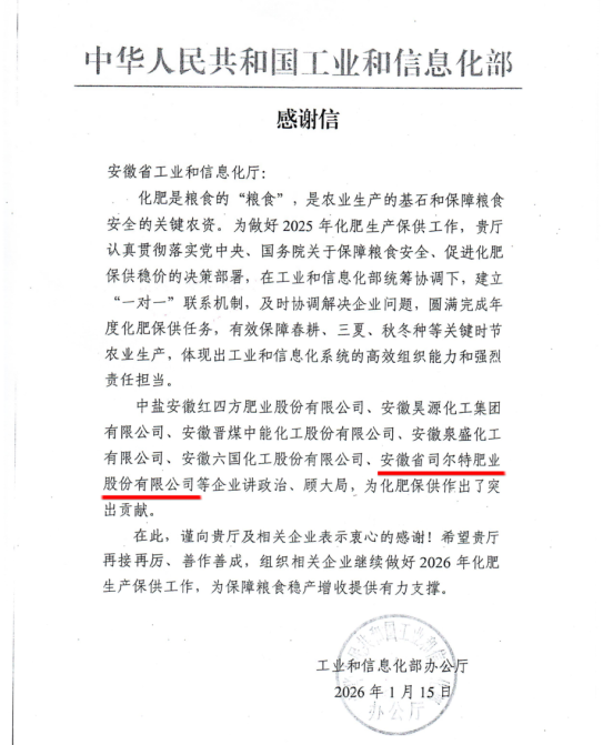 近日,安徽省经济和信息化厅收到工业和信息化部发来的感谢信。信中,工业和信息化部对司尔特股份等六家安徽企业在2025年化肥稳产保供工作中作出的突出贡献表示衷心感谢,并给予高度评价和充分肯定。