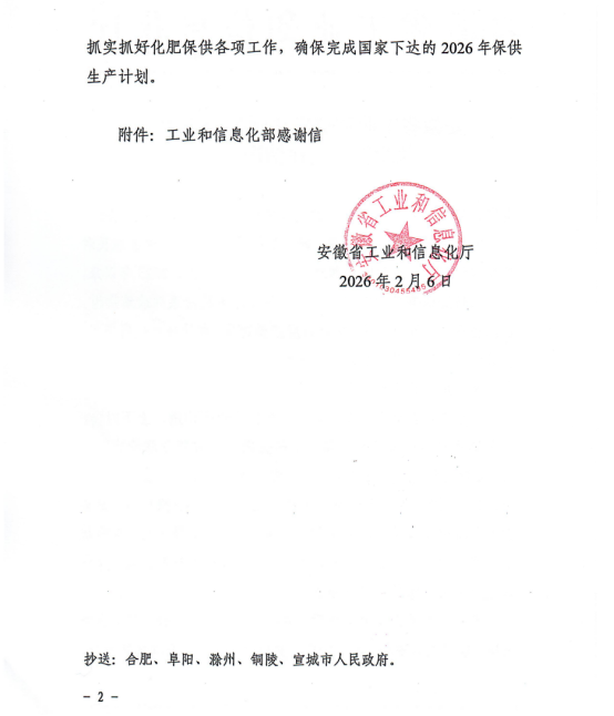 信中指出,化肥是粮食的“粮食”,是农业生产的基石,对保障国家粮食安全具有重要意义。安徽省司尔特肥业股份有限公司等企业政治站位高、大局意识强,主动担当作为,在化肥稳产保供方面发挥了重要作用。希望相关企业再接再厉、持续发力,扎实做好2026年化肥保供各项工作,为保障粮食稳产丰收提供坚实支撑。