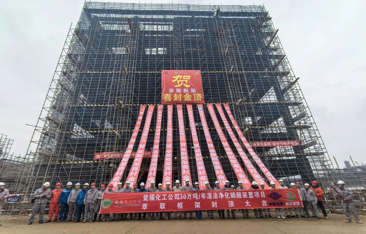 2月5日,由中国化学工程所属中国五环工程有限公司EPC总承包建设的瓮福化工公司30万吨/年湿法净化磷酸装置项目萃取框架主体结构顺利封顶。至此,项目工艺主装置全面封顶,项目土建结构主体施工取得决定性胜利,为后续安装工程的全面展开奠定坚实基础。